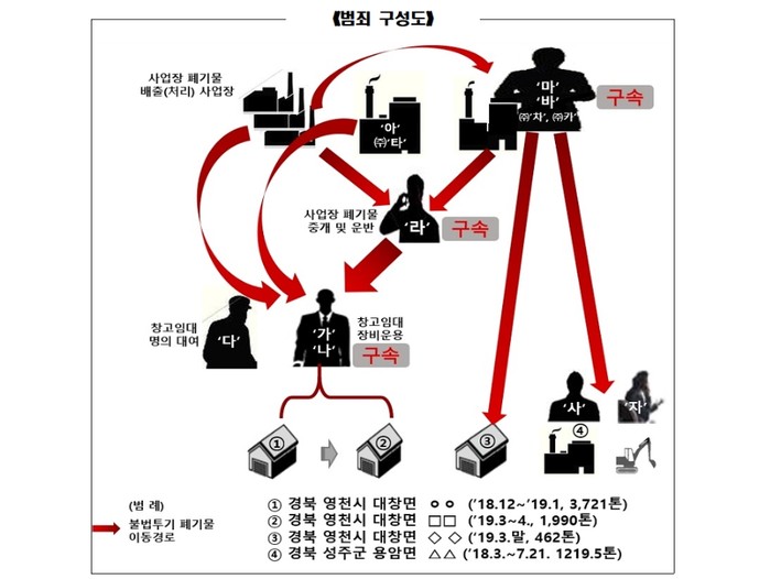 무허가 폐기물처리업자인 '가'는 2018년 12월 24일 경북 영천시 대창면에 다른 사람 이름으로 창고를 빌린 후 폐기물알선책 '라'에게 폐기물과 화물차량의 알선을 요청했다. 폐기물처리업자 '마' 등은 '라'의 알선으로 자신의 사업장과 거래처에서 발생한 폐기물을 '가'에게 반입했다.